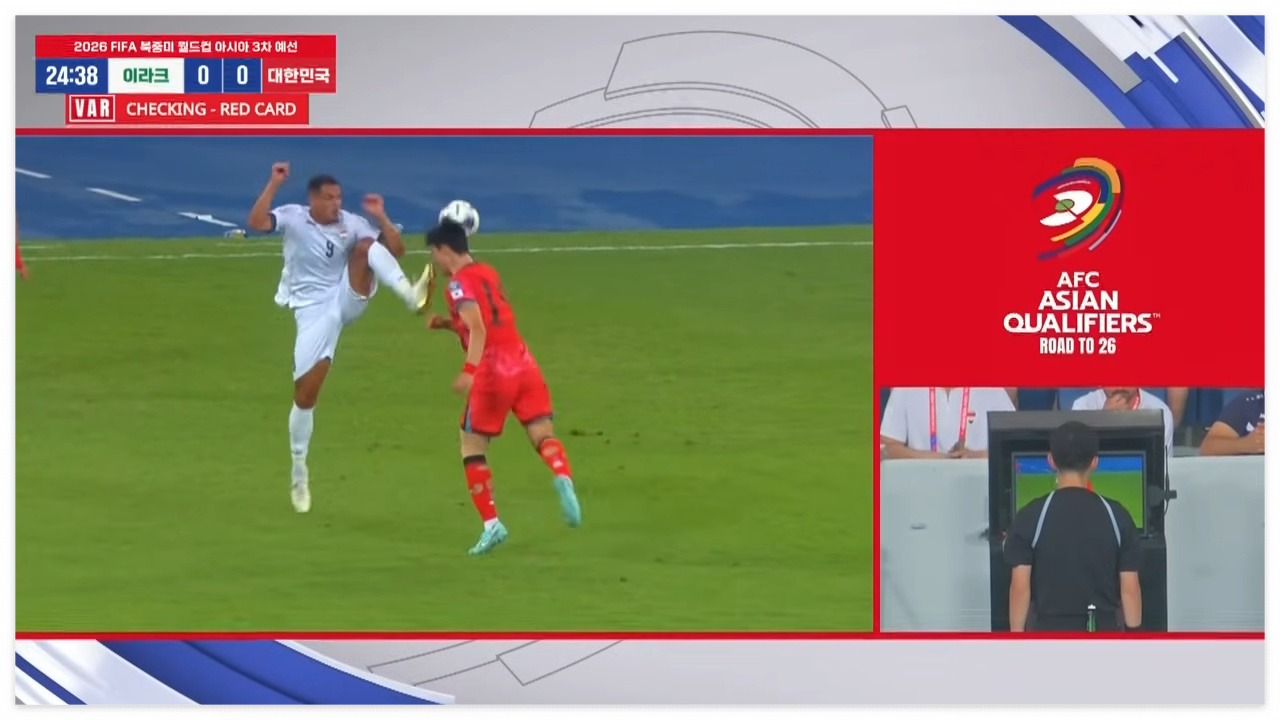 이라크의 알리 알 하마디 선수가 조유민의 얼굴을 발로 가격했고, VAR 판독 끝에 다이렉트 퇴장!