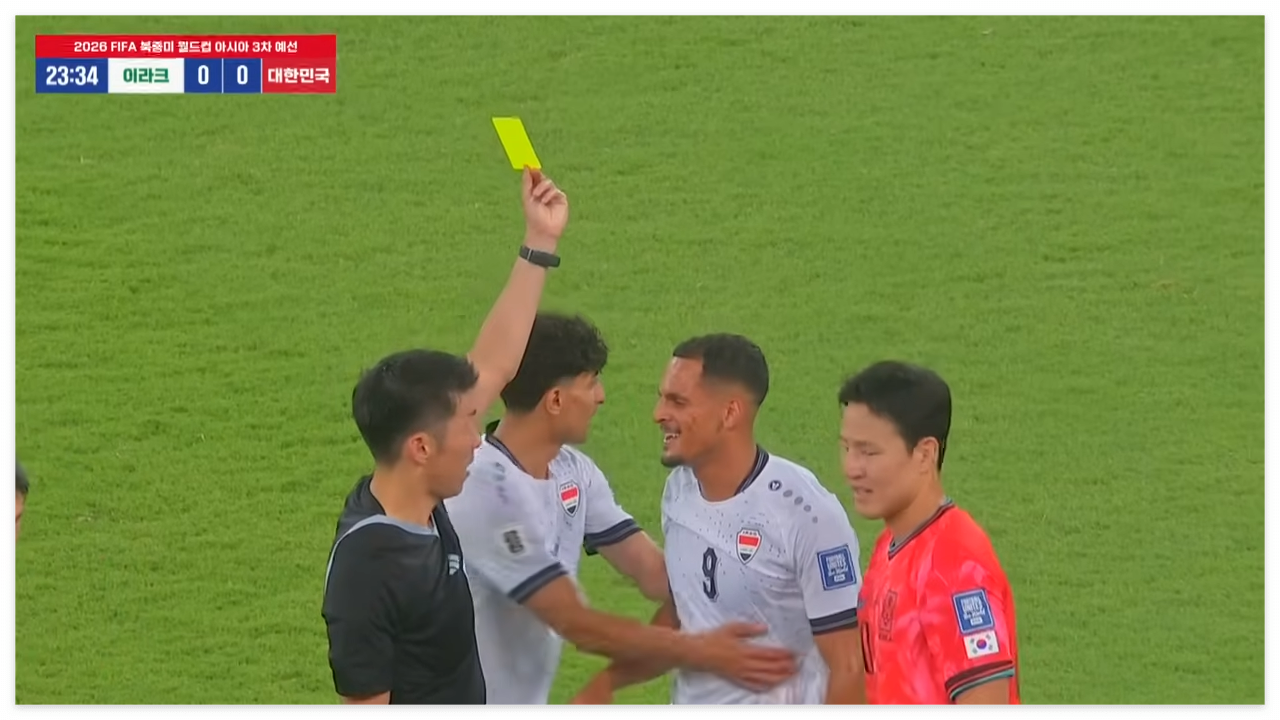 이 퇴장으로 이라크는 수적 열세, 한국은 공격 주도권을 확실히 잡기 시작합니다.