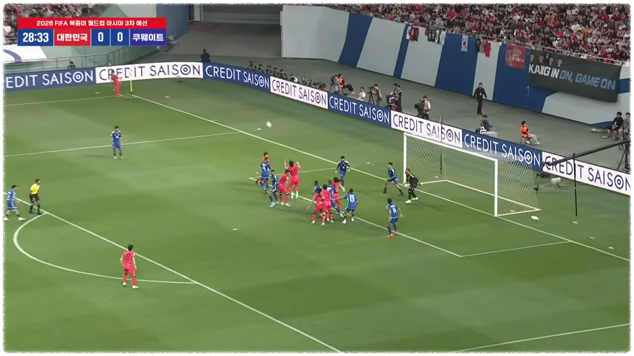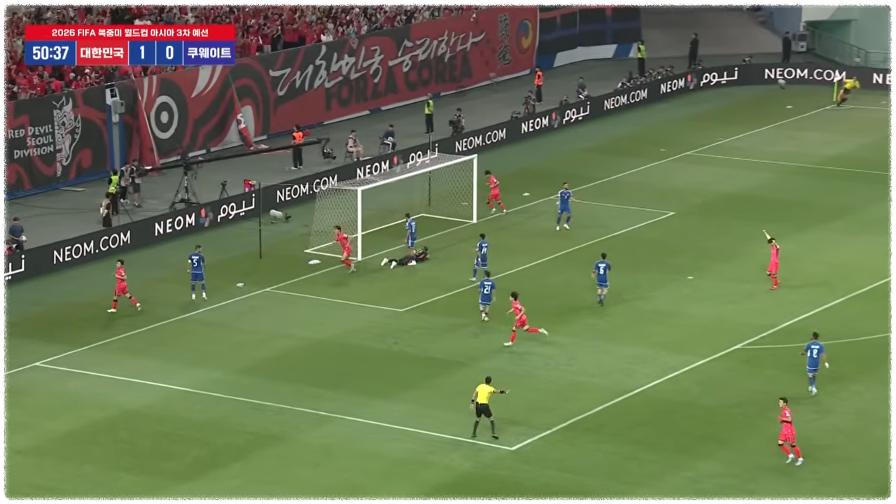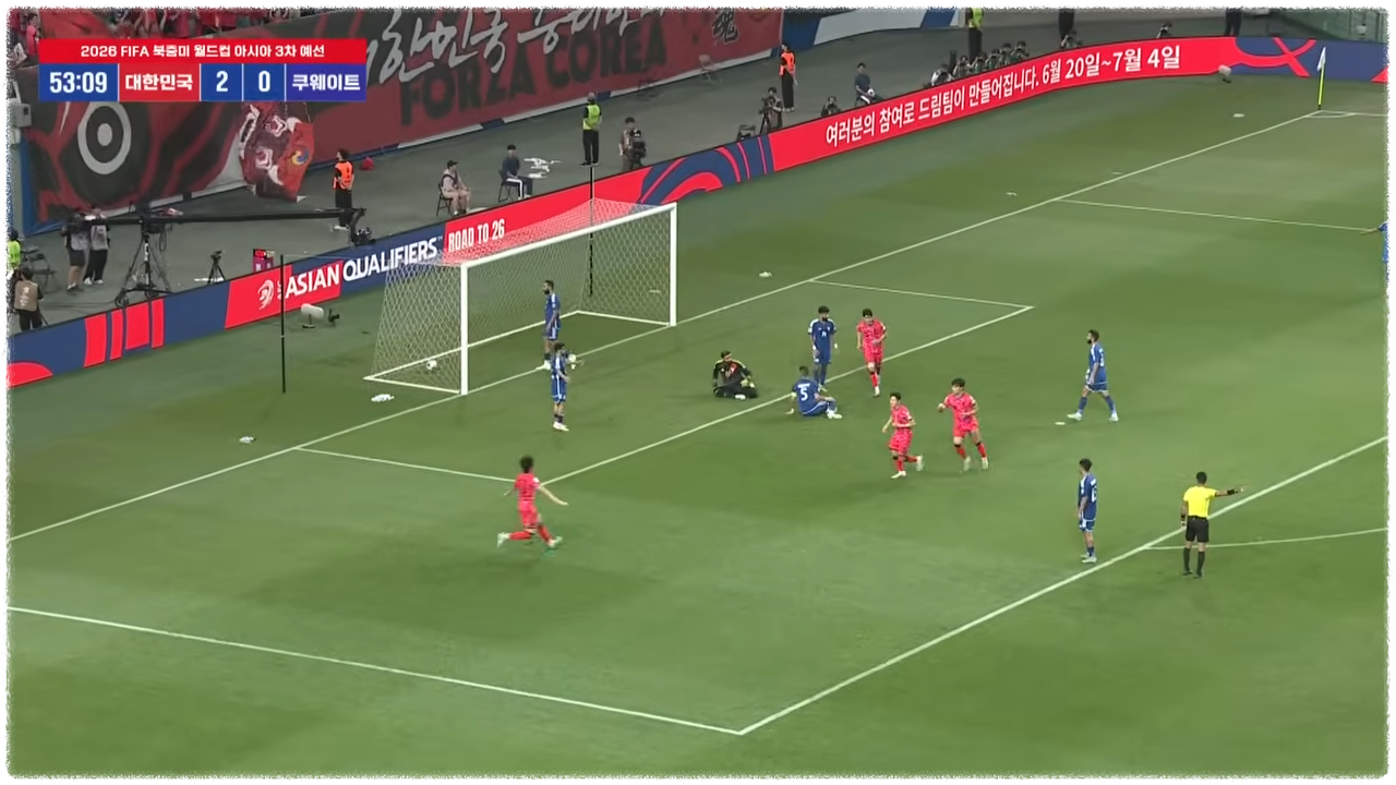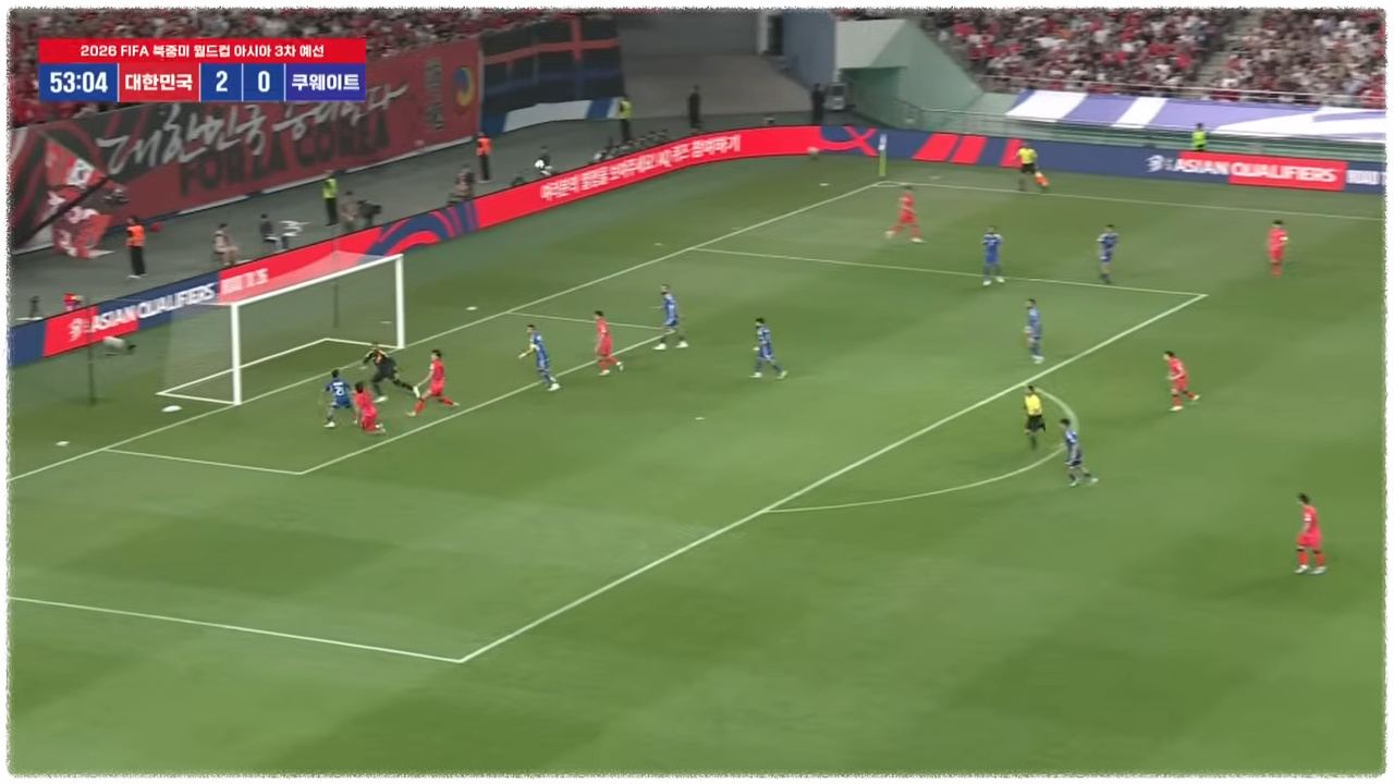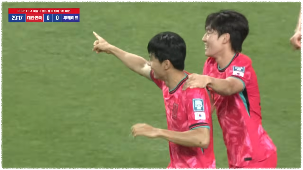 3분 뒤, 이번에는 오현규가 배준호의 헤더 패스를 오른발 터닝슛으로 연결, 완벽한 3번째 골을 만들어냈습니다. 쿠웨이트 수비진은 반응조차 하지 못했고, 오현규는 자신의 A매치 4번째 골을 자축했죠.