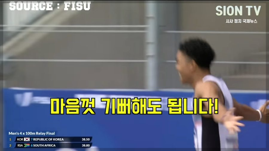 이날 경기에서 한국은 남아프리카공화국(38초80), 인도(38초89) 등을 제치고 가장 먼저 결승선을 통과했습니다.