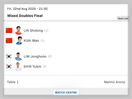 | 혼합복식 결승 | 🇰🇷임종훈/신유빈 vs 🇨🇳린스둥/콰이만 | 8월 23일(토) 04:00 |