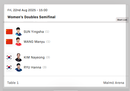 | 여자복식 준결승 ① | 🇯🇵나가사키/🇰🇷신유빈 vs 🇯🇵하리모토/오도 | 8월 22일(금) 19:45 |