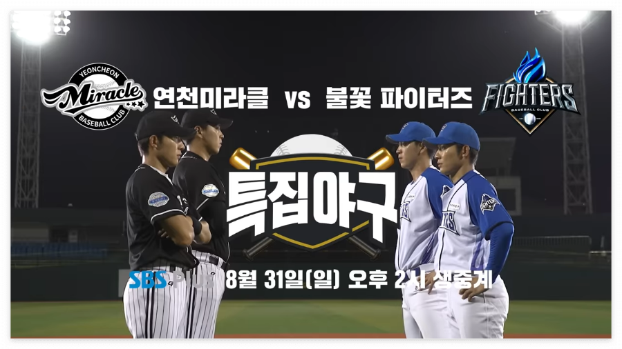 🔥야구의 짜릿함, 예능의 재미, 그리고 선수들의 열정이 모두 담긴 불꽃야구! 8월 31일 오후 2시, SBS 플러스에서 방송되는 불꽃파이터즈 vs 연천미라클의 뜨거운 맞대결, 절대 놓치지 마세요!