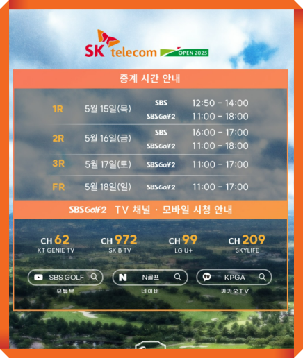 | 1R | 5월 15일(목) | SBS / SBS Golf2 | SBS: 12:50 ~ 14:00 SBS Golf2: 11:00 ~ 18:00 |