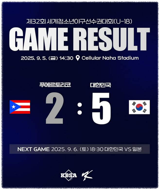 | 9월 5일(금) | 14:30 | 🇵🇷 푸에르토리코 2:5 🇰🇷 대한민국 | Cellular Naha |