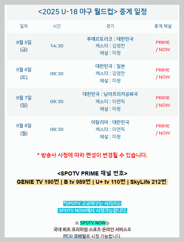 - 온라인 스트리밍: SPOTV NOW, WBSC 공식 유튜브 채널