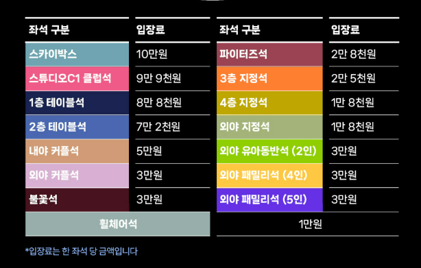 응원석: 30,000원 (응원봉+티셔츠 포함)