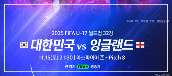 한국과 잉글랜드의 32강 대결이 펼쳐집니다. 날짜로 따지면 2025년 11월 15일 토요일이죠.